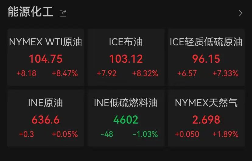 国际原油价格应声上涨。NYMEX WTI原油、ICE布油双双涨超8%。